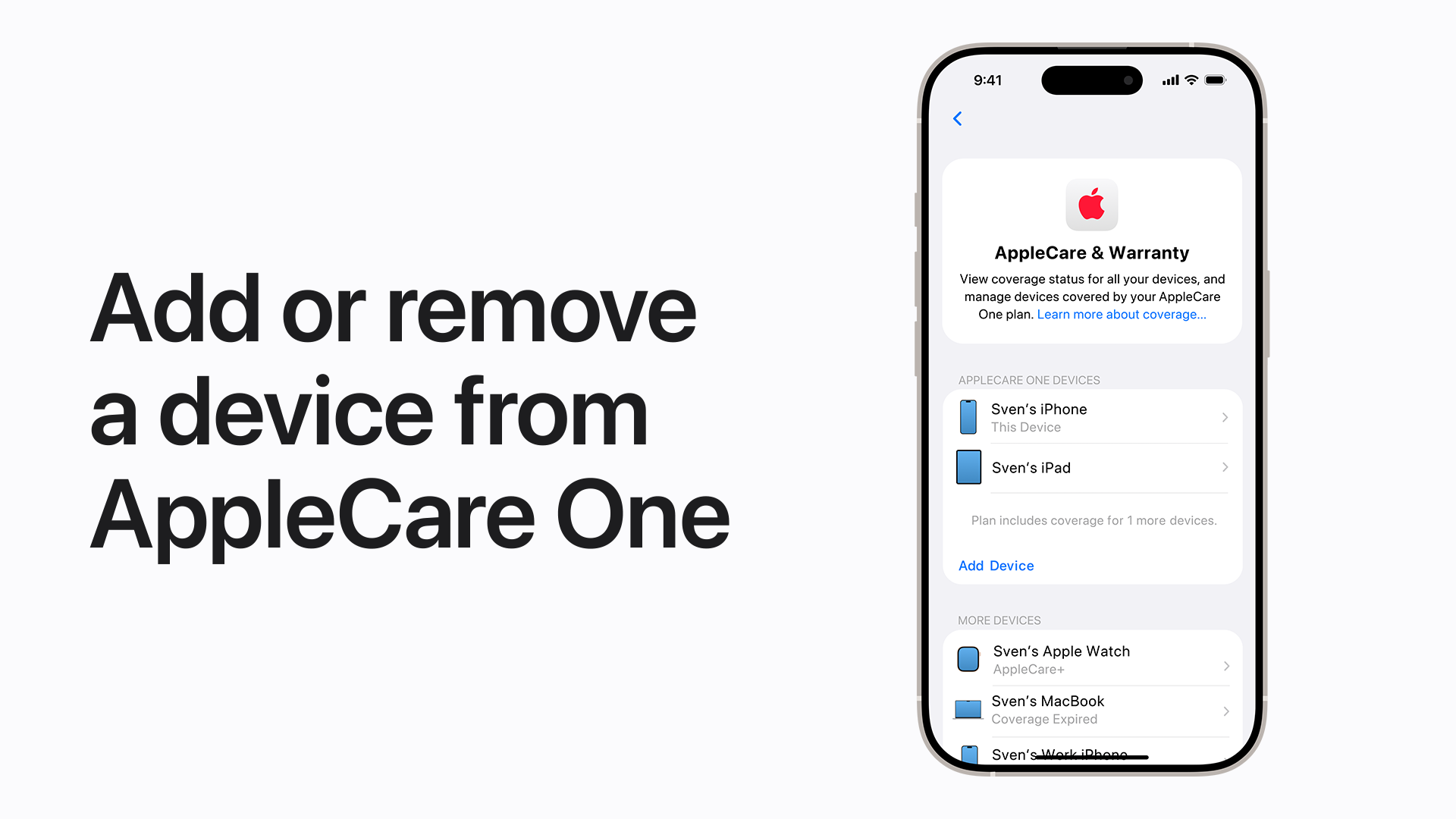 Klanten kunnen apparaten tot vier jaar oud toevoegen aan hun AppleCare One-abonnement. Koptelefoons moeten minder dan één jaar oud zijn om in aanmerking te komen voor dekking.