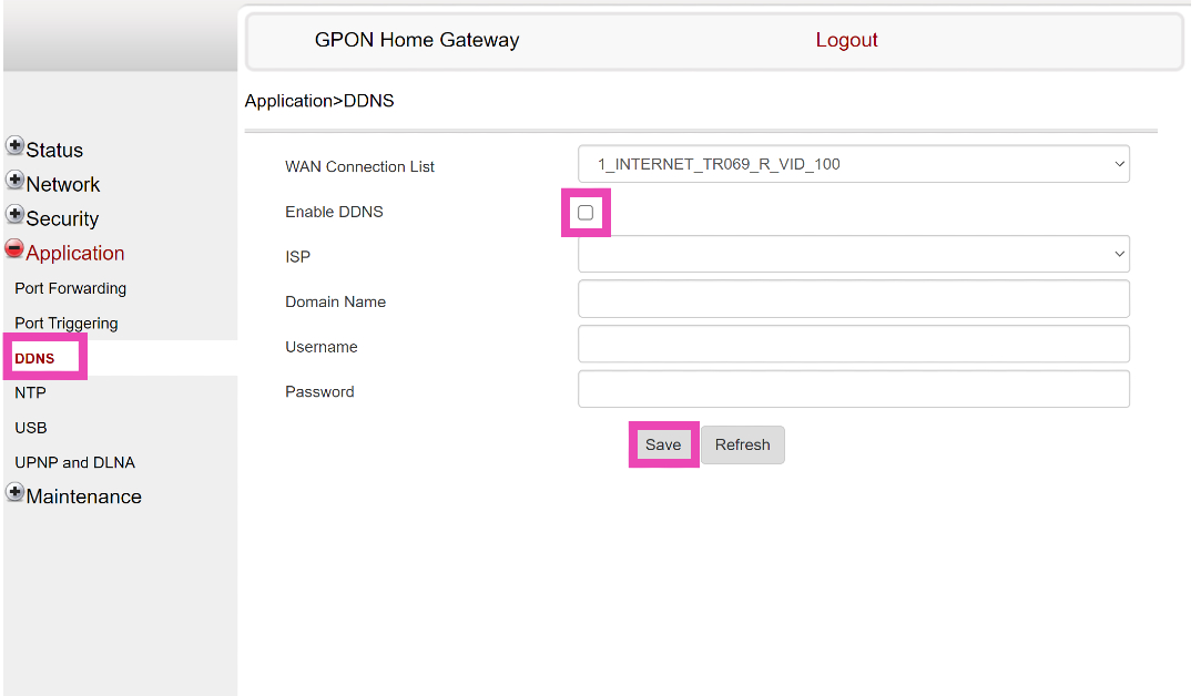 Ga naar de gatewaypagina van uw WiFi-router en selecteerToepassing>DDNS. Voer de domeinnaam, ISP, gebruikersnaam en wachtwoord in om het in te stellen.