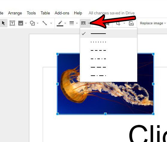 selecteer de afbeelding met de rand en klik vervolgens opGrens streepjeknop in de werkbalk en selecteer de gewenste stijl.
