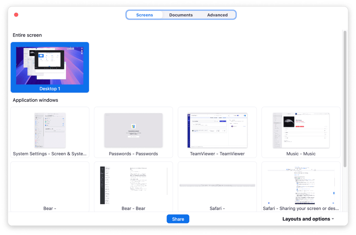 Je kunt je hele scherm, een deel van het scherm of specifieke applicatievensters delen in de Zoom-app. Volg voor elk de onderstaande stappen: