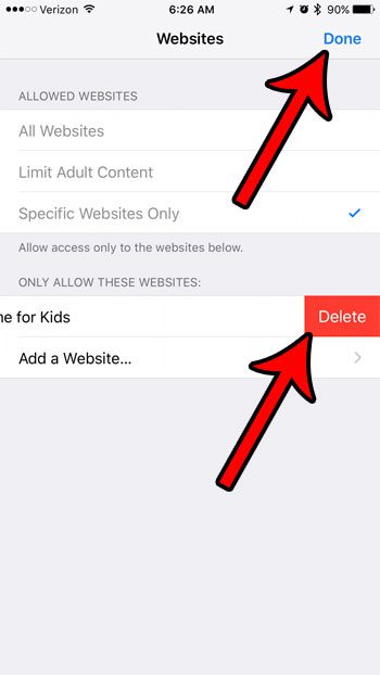 Stap 10: Raak het rood aanVerwijderenknop. Herhaal stap 9 en 10 voor elke site die in deze sectie wordt vermeld. Zodra er geen websites meer worden vermeld, tikt u op deKlaarknop rechtsboven in het scherm.