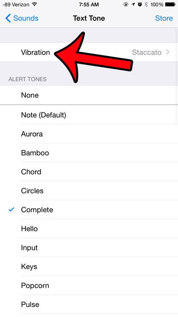 Stap 3: Selecteer deTeksttoonoptie. Merk op dat er bovenaan dit scherm ook enkele trillingsinstellingen staan. U kunt ervoor kiezen om uw iPhone op belsignaal of stil te laten trillen door de juiste optie in het te selecterenTrillensectie.