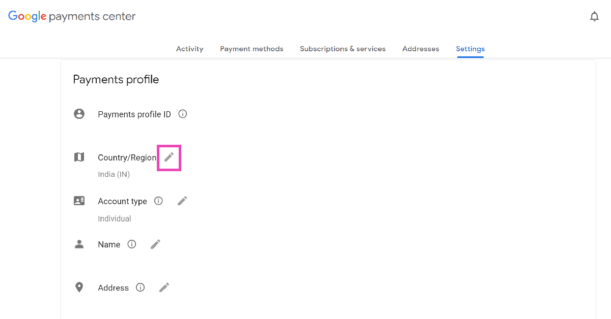 Stap 4:Klik op depotloodpictogram (bewerken).naast Land/regio.