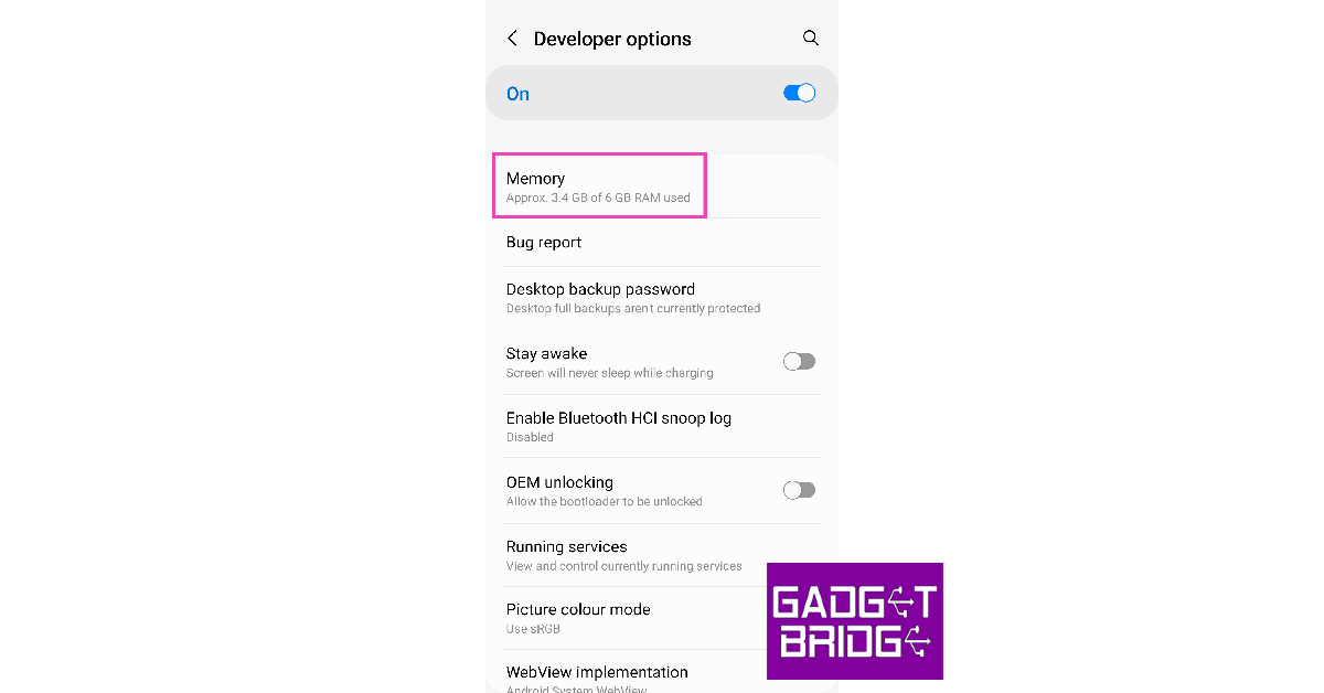 Om het real-time RAM-gebruiksniveau te controleren, is ingeschakeldje Android-telefoon, schakel de ontwikkelaarsmodus in door zeven keer op het buildnummer te tikken en ga vervolgens naarOpties voor ontwikkelaars>Geheugen.
