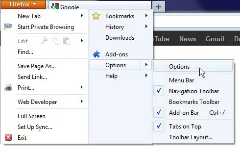 Stap 2: Klik op het tabblad “Firefox” in de linkerbovenhoek van de webbrowser, klik op “Opties” en klik vervolgens nogmaals op “Opties”.