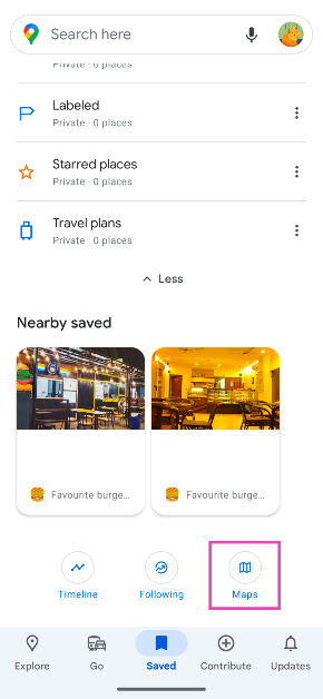 Start de Google Maps-app, ga naar het tabblad Opgeslagen, tik op Kaarten en selecteer vervolgens uw aangepaste kaart.