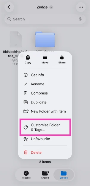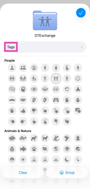Ga naar de app Bestanden, druk lang op een map en selecteer ‘Map en tags aanpassen’. Om het pictogram te wijzigen, selecteert u een symbool uit de lijst of tikt u op ‘Emoji’ en kiest u er een. Om de kleur te wijzigen, tikt u op ‘Tags’ en maakt u een selectie.