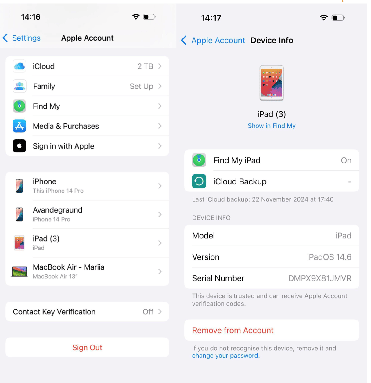 - Scroll naar beneden om een lijst te zien met apparaten die zijn verbonden met uw Apple ID.