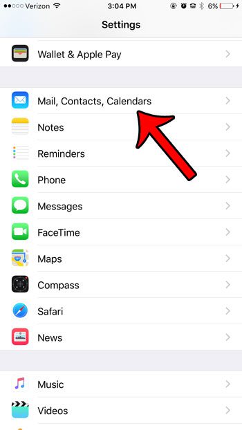 Houd er rekening mee dat er in sommige eerdere versies van iOS geen menu Wachtwoorden en account is, dus u zult in plaats daarvan het menu Mail, Contacten, Agenda's moeten doorlopen. U kunt dit artikel lezen als u het standaard e-mailaccount moet aanpassen nadat u deze wijziging heeft aangebracht.