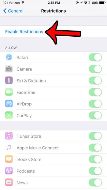 Stap 4: Tik op het blauwBeperkingen inschakelenknop. Als u eerder Beperkingen had ingeschakeld, moet u in plaats daarvan de bestaande toegangscode invoeren en kunt u doorgaan naar stap 7.