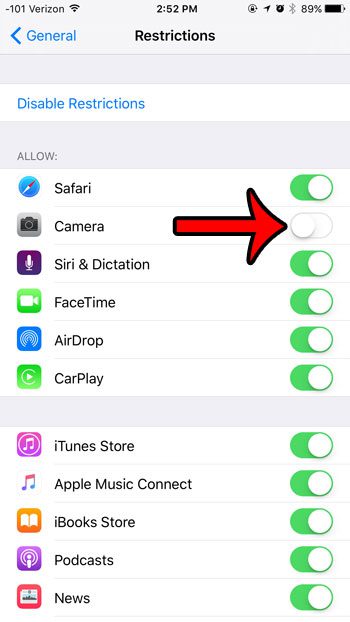 Stap 7: Tik op de knop rechts vanCameraom het uit te schakelen. U weet dat de camera is uitgeschakeld als er geen groene schaduw rond de knop is. De iPhone-camera is uitgeschakeld in de onderstaande afbeelding.