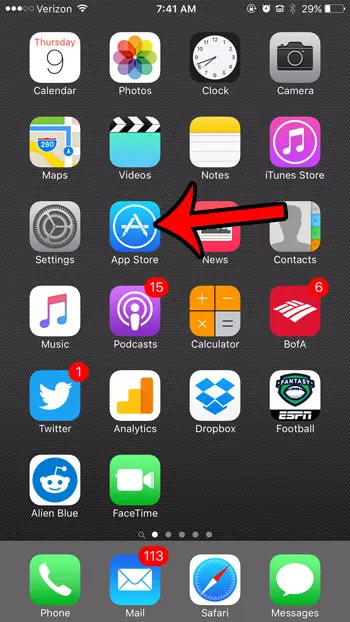 Ons artikel gaat hieronder verder met aanvullende informatie over het downloaden van apps op een iPhone 6, inclusief afbeeldingen van deze stappen.