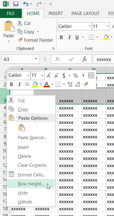 U kunt de grootte van een rij ook numeriek opgeven door met de rechtermuisknop op het rijnummer te klikken en vervolgens op te klikkenRij hoogteoptie.