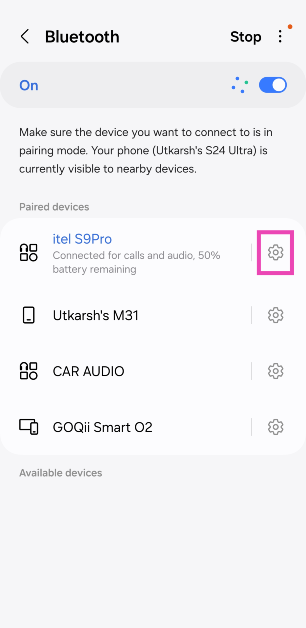 Stap 2:Raak detandwiel icoonnaast de aangesloten TWS.