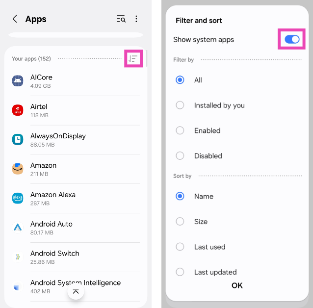 Stap 2:Raak defilterpictogramen zet de tuimelschakelaar ernaast aanSysteem-apps tonen.