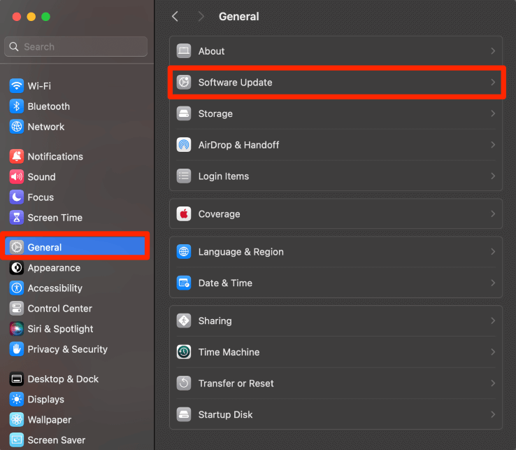 Navigeer aan de linkerkant naarAlgemeenen kiesSoftware-updateaan de rechterkant.