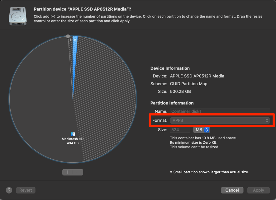 In het volgende scherm,Formaatde schijf naar een schijf die compatibel is met uw Mac en klik op Toepassen om te bevestigen.