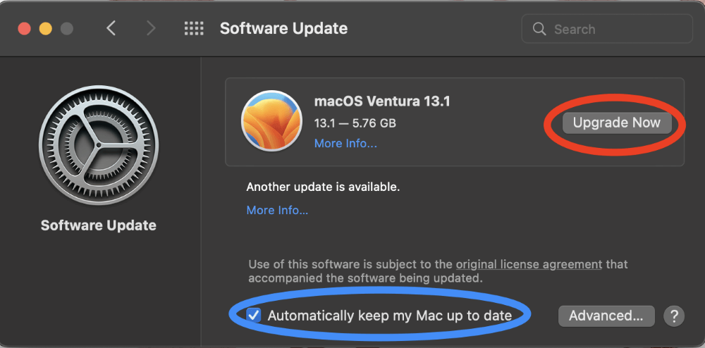Opmerking: ik raad aan om “Houd mijn Mac automatisch up-to-date" ook. Op deze manier MOET je Mac, wanneer hij aan staat en is aangesloten op een voedingsbron, (maar dat gebeurt niet altijd - dus maak zeker van de gelegenheid gebruik om het te controleren!) een update voor je. Op deze manier loop je minder risico dat een verouderde MacOS de reden is voor eventuele problemen.