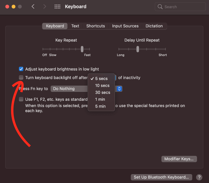 Vink het vakje aanstel het toetsenbord van uw MacBook Pro in om na 5 seconden uit te schakelen. Dit is de kortst toegestane instelling en zorgt ervoor dat de batterij van uw toetsenbord niet snel leegraakt.