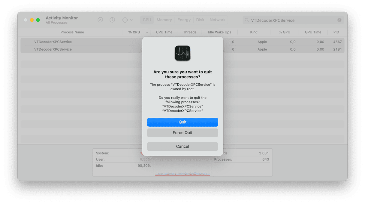 - Als je merkt dat VTDecoderXPCService bijna alle CPU-cycli van je Mac of meerdere GB RAM gebruikt, weet je dat dit het probleem veroorzaakt.