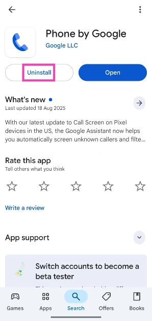 Hoewel er nog geen manier is om over te schakelen naar het oude ontwerp, kun je de vorige versie van de Telefoon-app herstellen door de nieuwe update te verwijderen. Ga naar de Google Play Store, zoek naar ‘Phone by Google’, tik op het resultaat en klik op ‘Installatie ongedaan maken’. Zorg ervoor dat u op de ellipsen tikt en ook 'Automatische update inschakelen' uitschakelt.
