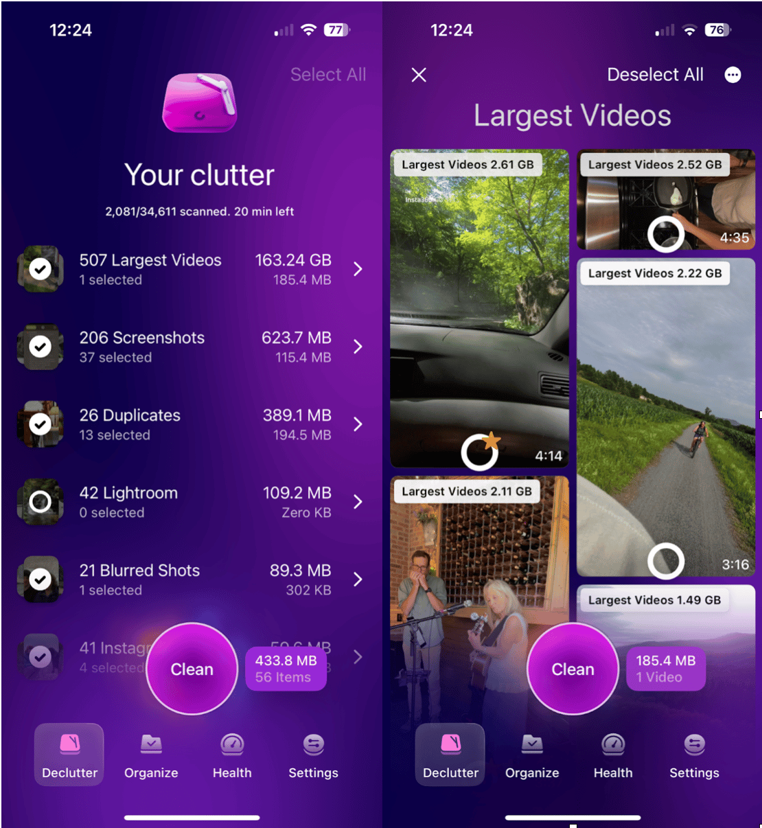 CleanMy®PhoneMet de Declutter Module kunt u uw mediabibliotheek binnen enkele minuten veilig opruimen, zodat u ruimte kunt maken zonder de video's kwijt te raken die u eigenlijk wilt behouden, en met de Organize Module kunt u video's comprimeren zonder dat de kwaliteit afneemt.