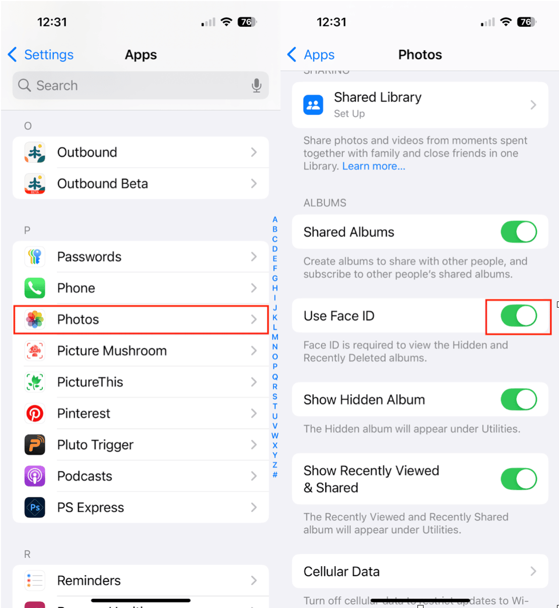 Voeg een extra beschermingslaag toe door uw verborgen album te vergrendelen, zodat het alleen kan worden bekeken met uw Face ID of Touch ID. U kunt dit als volgt inschakelen:
