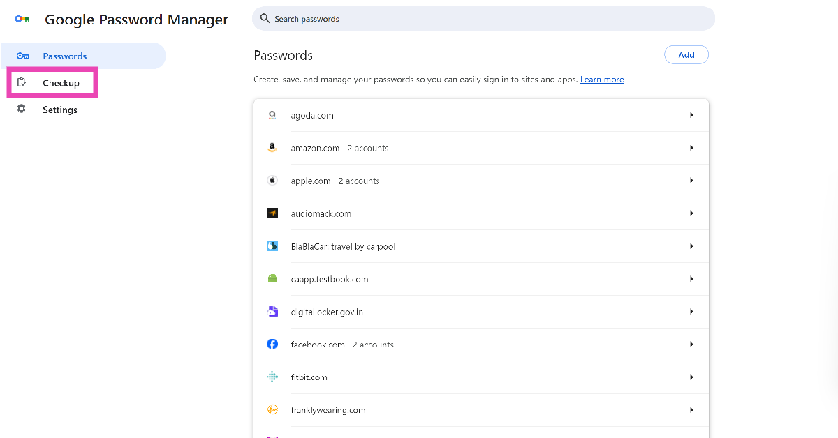Ga naarGoogle Chrome>Instellingen>Automatisch aanvullen en wachtwoorden>Google Wachtwoordmanageren selecteer ‘Checkup’ in de zijbalk. De wachtwoordbeheerder begint automatisch met het uitvoeren van een veiligheidscontrole op uw opgeslagen wachtwoorden.