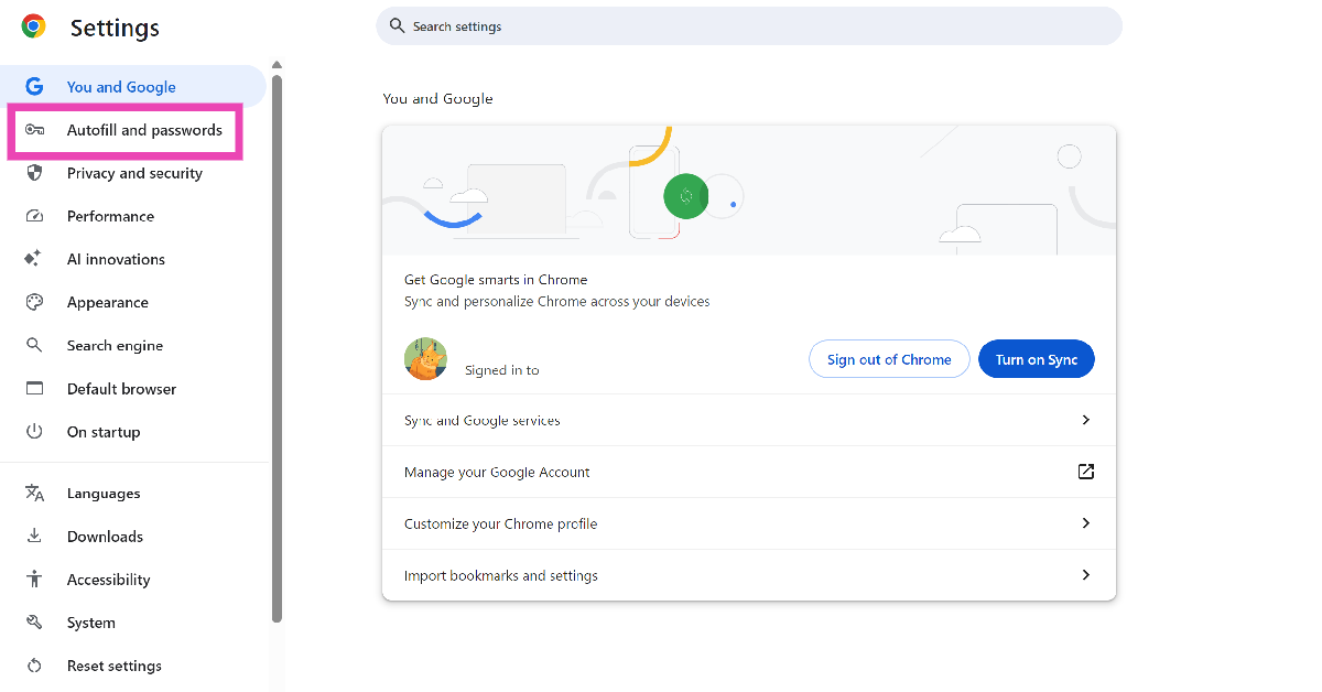 Stap 2:SelecteerAutomatisch aanvullen en wachtwoordenvanuit de zijbalk.
