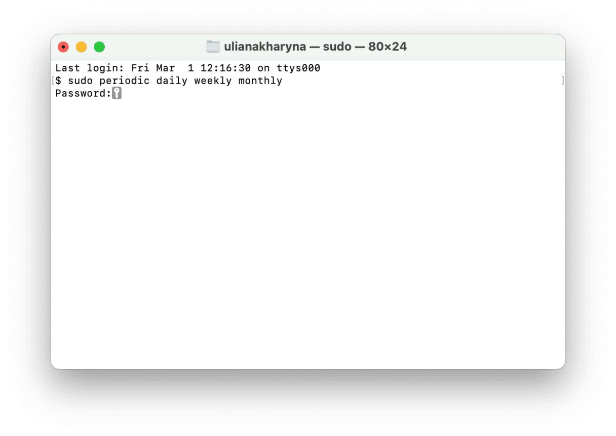 Als u slechts één onderhoud wilt uitvoeren (misschien heeft u uw maandelijkse script gemist of heeft u weinig tijd), kunt u de Terminal-opdracht bewerken naarsudo periodic monthlyen typ het in Terminal.