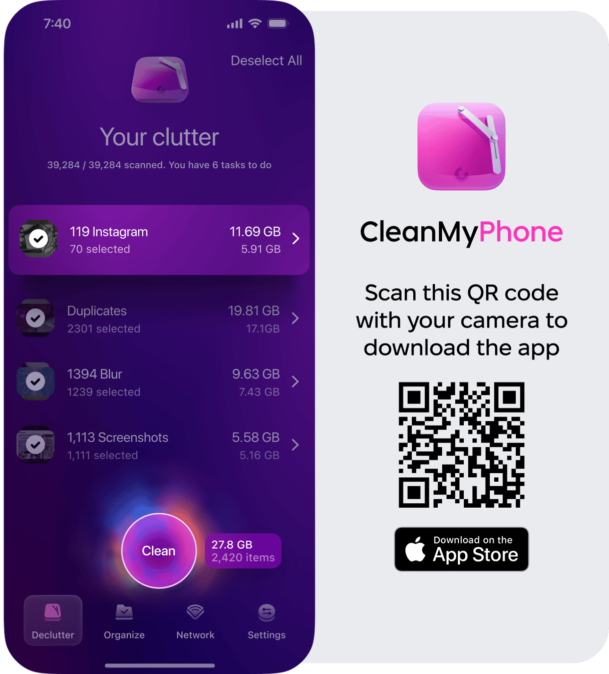 Het delen van foto's op Instagram kan stilletjes de opslagruimte van je iPhone vullen, omdat de app lokale kopieën bewaart van wat je plaatst.CleanMy®Phonehelpt je die ruimte terug te winnen door dubbele Instagram-foto's te identificeren en te verwijderen die op je apparaat zijn opgeslagen.