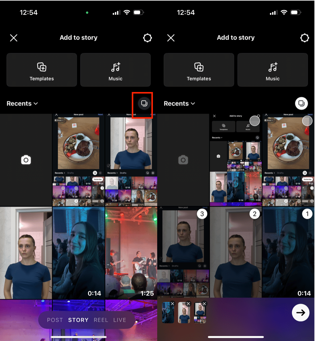 - Kies de foto's die je in je verhaal wilt opnemen. Je kunt maximaal tien foto's tegelijk aan je verhaal toevoegen. Telkens wanneer u een foto selecteert, verschijnt er een nummer in de cirkel erboven, zodat u de volgorde kunt kiezen waarin u uw foto's wilt uploaden.