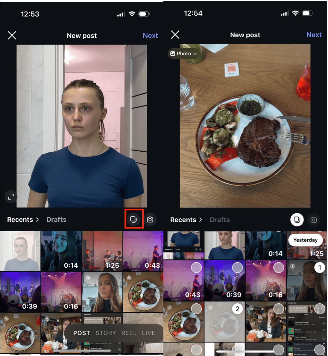 - Selecteer meerdere foto's om toe te voegen aan je Instagram-bericht. Er verschijnt een nummer op de foto, zodat je weet in welke volgorde ze in je bericht verschijnen.