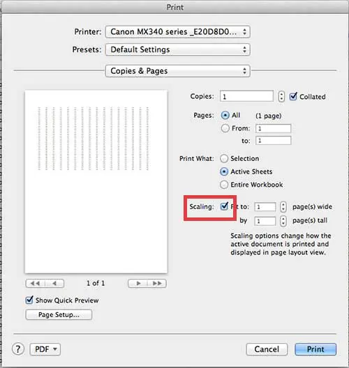 Dit geeft u de mogelijkheid om aan te geven hoe het werkblad gedimensioneerd moet worden, zodat het op de pagina past. U kunt het werkblad schalen zodat het op één pagina past, of u kunt de schaal kiezen die u wilt gebruiken.