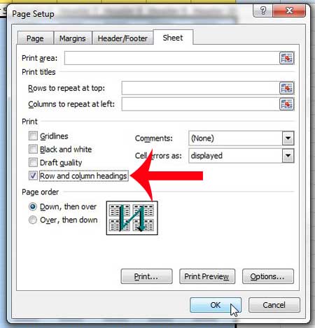 Stap 5: Vink het vakje links van aanRij- en kolomkoppenin deAfdrukkengedeelte van het venster en klik vervolgens op deOKknop onderaan het venster om de wijzigingen te bevestigen.