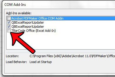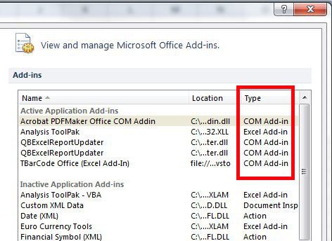 Stap 5: Zoek het type invoegtoepassing dat u wilt verwijderen door het aan te vinkenTypekolom rechts van de naam van de invoegtoepassing. Bijvoorbeeld DeAdobe PDFMakerheeft een soortCOM-invoegtoepassing, terwijl deAnalysetoolpakheeft een soortExcel-invoegtoepassing.