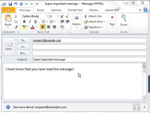 Er zijn echter enkele zaken waarmee u rekening moet houden voordat u begint met het toevoegen van een leesbevestiging aan elke e-mail die u verzendt via uw Microsoft Outlook 2010-e-mailtoepassing. In de eerste plaats houdt niemand van leesbevestigingen.