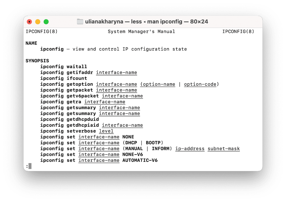 Als je gewoon ipconfig in Mac Terminal typt, doet het niets anders dan een bericht weergeven waarin staat dat ‘ipconfig’ moet worden gevolgd door een commando en een argument. Vervolgens worden voorbeelden van opdrachten weergegeven. Een goede plek om te beginnen is door man ipconfig in te typen en op Return te drukken. Dan wordt de handleiding voor ipconfig weergegeven, waarin meer wordt uitgelegd over de opdrachten en wat ze doen.