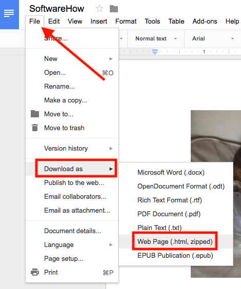 Stap 4:Klik in het Google-document op het menu en selecteer Bestand > Downloaden als > Webpagina (.html, gecomprimeerd).
