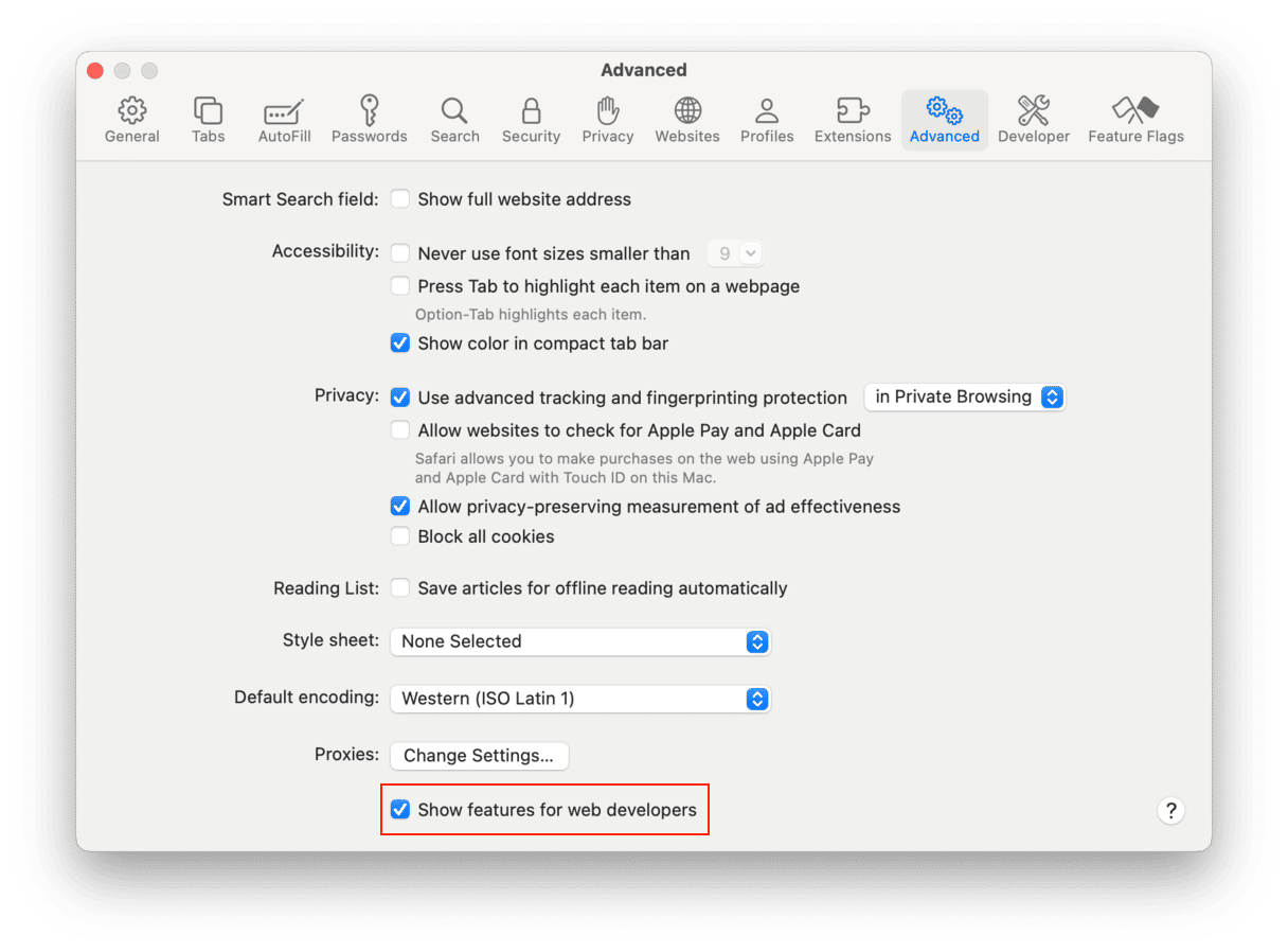 - Schakel “Toon ontwikkelmenu in de menubalk” / “Toon functies voor webontwikkelaars” in.