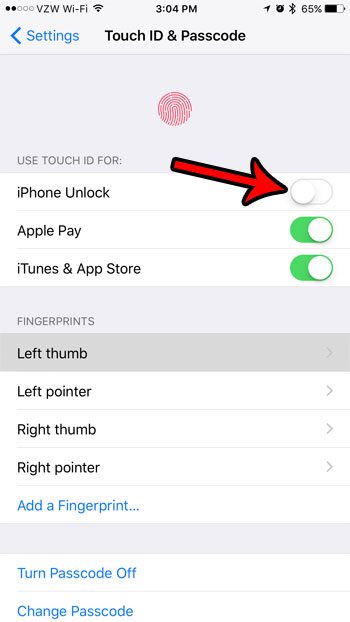 Stap 4: Raak de knop rechts van aaniPhone-ontgrendelingom het uit te schakelen.