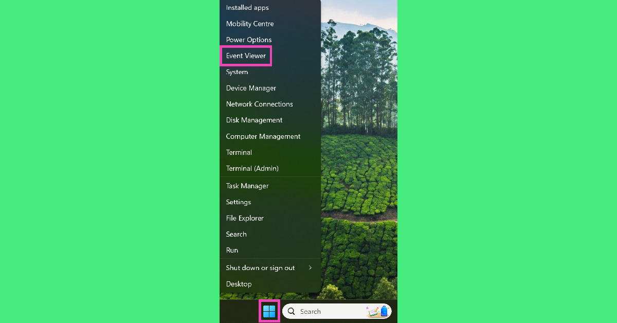 Stap 4:Als Windows de resultaten niet automatisch laadt, klik dan met de rechtermuisknop op het Start-pictogram en selecteerGebeurtenisviewer.
