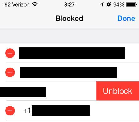Stap 6: Raak deDeblokkerenKnop rechts van het telefoonnummer of contactnaam.