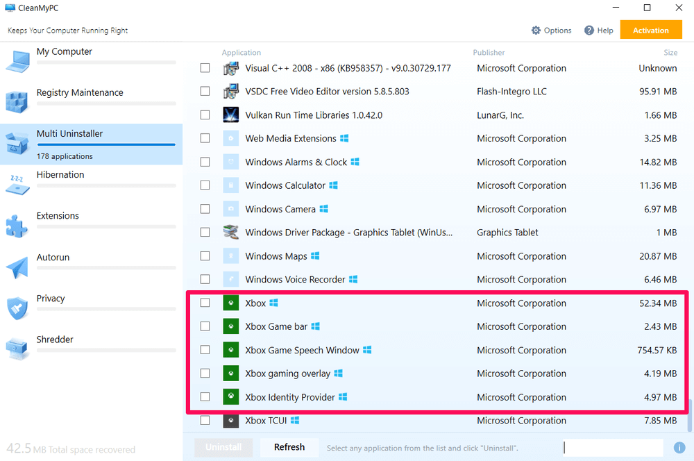 Zodra CleanMyPC is geïnstalleerd, opent u het programma en kiest u “Multi Uninstaller”. In deze lijst wordt de Xbox-applicatie daadwerkelijk vermeld en deze kan desgewenst worden verwijderd. Vink eenvoudigweg de vakjes aan en druk vervolgens op de groene knop ‘Verwijderen’.
