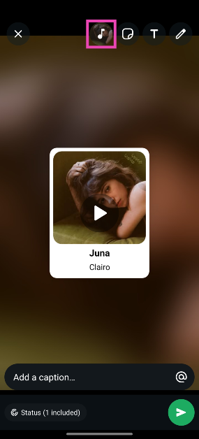 Selecteer een afbeelding of video om als status te plaatsen en klik op het muzieknootpictogram of selecteer de muzieksticker. Zoek naar een nummer en tik op het pijlpictogram om het aan uw status toe te voegen.