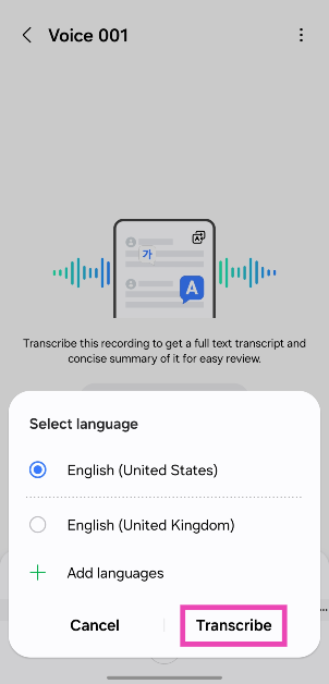 Gebruik Galaxy AI om een spraaknotitie te transcriberen en samen te vatten