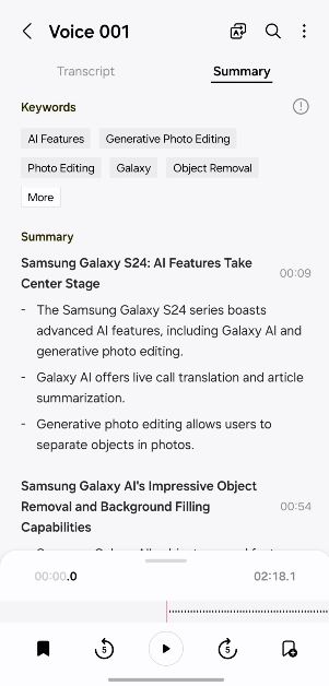Net als de nieuwere Pixel-smartphones kan de eigen voicerecorder-app van Samsung nu de spraaknotities voor u transcriberen. Als er meerdere sprekers op de stemopname staan, worden deze overeenkomstig geclassificeerd. Galaxy AI doet zijn best om ervoor te zorgen dat er geen redundanties en grammaticale fouten in de getranscribeerde tekst voorkomen. Als de toespraak echter niet openlijk duidelijk is, kunnen er een paar fouten binnensluipen. Gelukkig zijn deze fouten gemakkelijk te negeren. Galaxy AI vat de getranscribeerde tekst voor u samen en formatteert deze op een manier die gemakkelijk te lezen is. Het genereert trefwoorden die verband houden met onderwerpen die het belangrijk acht. Door op een trefwoord te tikken, komt u bij het gedeelte waar dit in de tekst wordt genoemd.