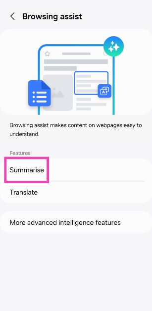 Stap 10:Galaxy AI zal eenkorte samenvattingvan de tekst op de webpagina.