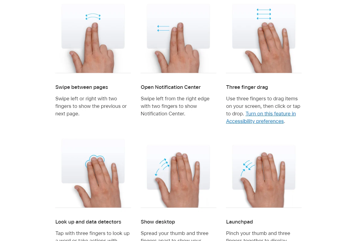 MacBook-trackpads bieden een reeks bewegingen die snelkoppelingen bieden voor veelvoorkomende taken, waardoor u uw Mac gemakkelijker zonder muis kunt bedienen. Deze gebaren kunnen variëren van eenvoudige klikken tot complexere multi-touch-manoeuvres.