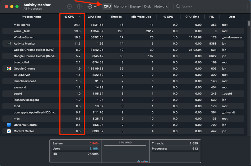 Open hiervoor de Activity Monitor (je kunt deze vinden inToepassingen) en klik vervolgens op deCPUtabblad.